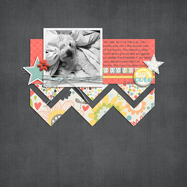 So ... it's April already. Where has the time gone? For you scrappy people ... the start of a new month means that there's a new Company Stash at Pixels and Company. Company Stash ... means coordinated kits by all of the designers at P&Co. I love that! For this page I used a number of this month's stash along with Tiffany Tillman's Wicked Crooked Templates. Again, love the colors!