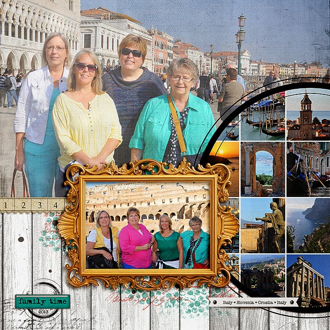 I thought I was finished with my 2013 album today and then I took one last look through the pages I created for the year and decided I wanted another page with photos of my mom, sisters and me on our Mediterranean Cruise this fall. I went with a design and used techniques from Jana Morton's Inspired Images class. This page was a lot of fun to create! (And do you know what? The cruise was a lot of fun too!)